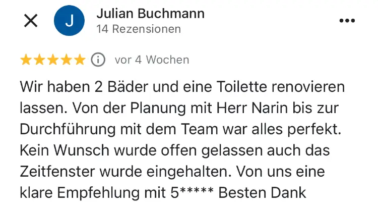 Die Sanierung kann in etwa 4-6 Wochen starten. Da wir das ganze Jahr über arbeiten und keinen festen Betriebsurlaub haben, sind wir flexibel. Sie können Ihr bevorzugtes Umbau-Datum auswählen. Klicken Sie dafür Hier